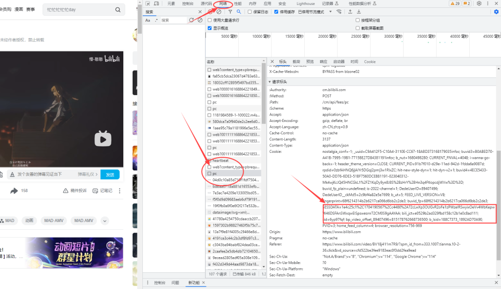 打开B站网页并登录,打开任意视频,按F12打开控制台 - 在上面找到【网络】 - 找到pc - 再找到cookies,