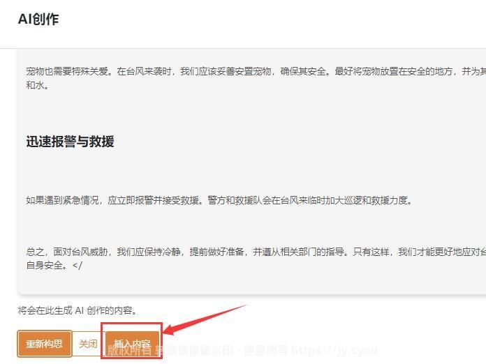 5.等待AI生成文章完毕,点击【插入内容】,这时候我们的生成文章就生成好了