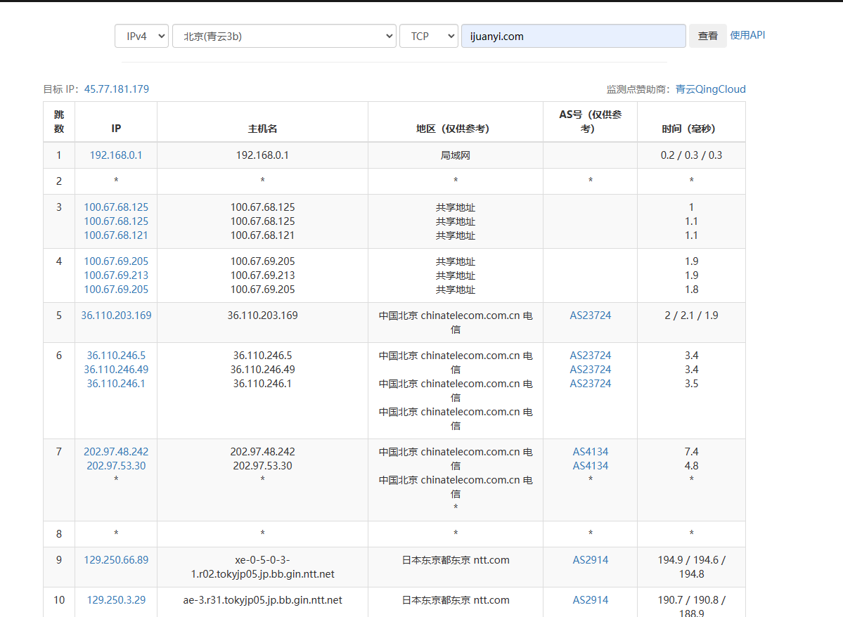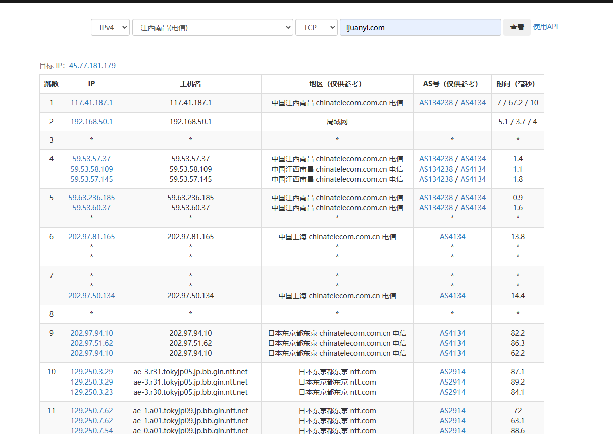 大家可以用IPIP的工具来测: TraceRoute查询
