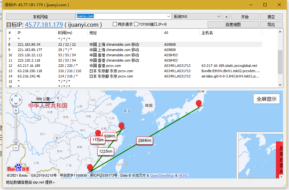 从南昌到我网络的情况就不一样了,可以看到先到上海,再到日本,本来下面可以看地图的,那个更加形象,但是IPIP貌似百度地图的API挂掉了,就大无语~