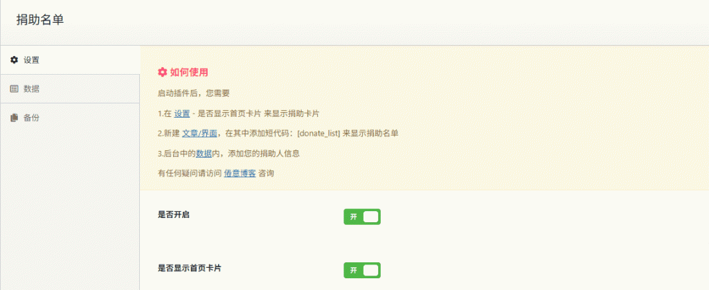 Donate List 是一个在WordPress主题上显示捐助人信息的插件,由倦意独立开发,可以在后台很轻松的将您的金主爸爸们的感谢信息显示在网站的各个角落,且非常方便管理。