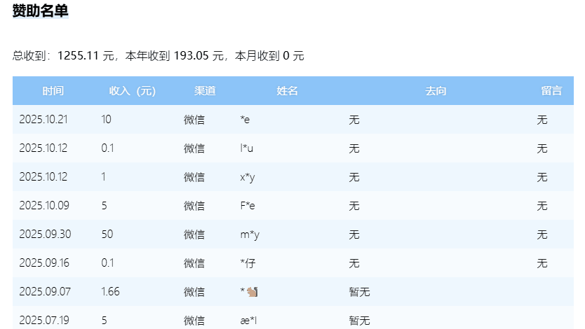 完整的显示赞助您的人员信息,包括时间,收入,渠道,姓名,留言等等,并且支持时间和金额的排序,以及统计总收入和每月收入。