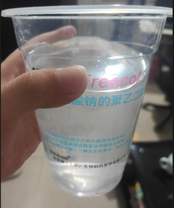 真的这辈子都没一口气喝这么多水,大家知道1.5L什么概念吗?相当于你要在一个小时内喝一瓶大的雪碧。这要味道要向雪碧那么好喝就算了,问题是跟喝盐水一样,喝了500ml我就实在喝不下去了,就边走边揉肚子边喝药。但是肠胃却开始不听话了起来,我感觉我的胃在疯狂收缩,不断有气从胃里打出来。本来8点喝药,我楞是喝到了10点。