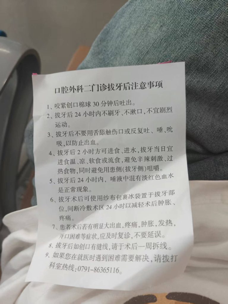 拔的过程很折磨,刚开始医生拿着好像钳子一样的东西在我嘴里拔,发现拔不出来,他于是拿来了类似于“切割机”一样的东西,“切割机”的声音很大,像是家里装修时工人锯铁条的声音。切下去一瞬间由于我的牙非常酸涨,忍不住叫了起来,而且我的全身也开始紧张的绷紧了。梁医生安慰我放松,并且提醒我把嘴巴张大,脖子往回缩一点。就这样锯了一下拔了一下,又锯了一下拔了一下,大概持续了十多次。因为实在太难熬了,每次锯的时候我都会数一下,后面次数太多我实在数不清了哈哈哈哈。在锯的过程中我心里默念:死牙快下来啊,别这么坚强。持续了大概40分钟,我的牙终于拔下来了,这时我的心里也落了一口气,心想总算是结束了。