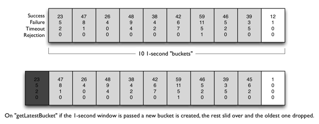 滑动窗口算法可以解决上面固定窗口的问题,像hystrix和sentinel中都使用该算法进行数据统计,用于限流熔断等策略处理。如hystrix中图所示,在一个窗口内拆分了10个桶(bucket),随着时间的推移,会创建新的桶也会丢弃过期的桶,当然窗口的大小和拆分桶的数量都是可配置的。