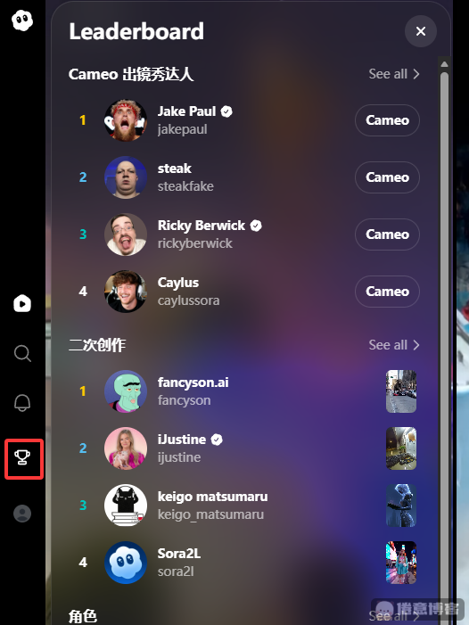 当然他们的平台也有一个类似于排行榜的功能,可以看到Sora平台上最多出镜人和二次创作热门排行,这点也类似于抖音。