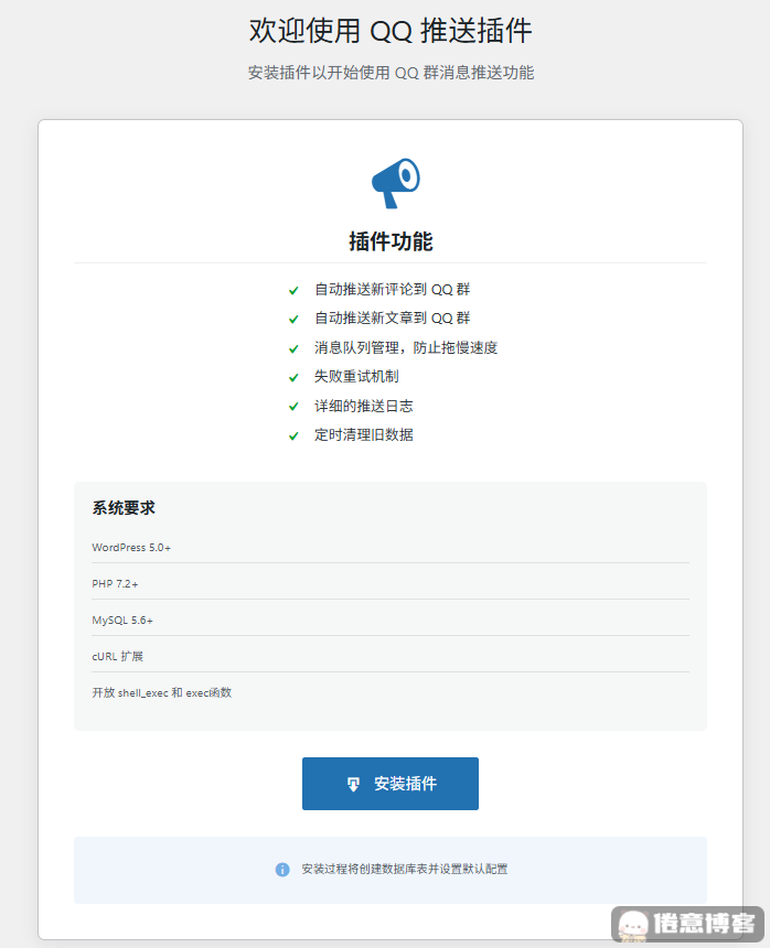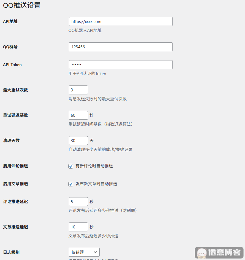 这是一款将博客的新评论和新文章自动推送到QQ群的插件,采用定时任务的方法推送信息,并且有一套完整的后台和详细的推送日志,对新手友好!󠄐󠄹󠅀󠄪󠄢󠄡󠄦󠄞󠄧󠄣󠄞󠄢󠄡󠄦󠄞󠄤󠄬󠅒󠅢󠄟󠄮󠄐󠅅󠄹󠄴󠄪󠄾󠅟󠅤󠄐󠄼󠅟󠅗󠅙󠅞󠄬󠅒󠅢󠄟󠄮󠅄󠅙󠅝󠅕󠄪󠄡󠄧󠄦󠄦󠄣󠄦󠄨󠄤󠄨󠄡󠄬󠅒󠅢󠄟󠄮