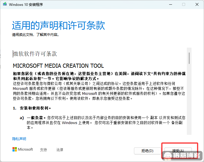 打开下载后的文件MediaCreationTool.exe,点击接受