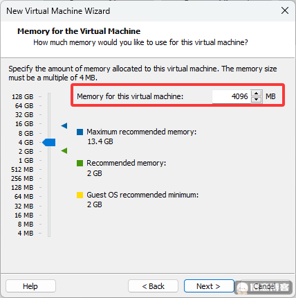 这一步是选择内存大小,绿色为你目前可以分配的最大大小,推荐选择到4096M(4G内存)